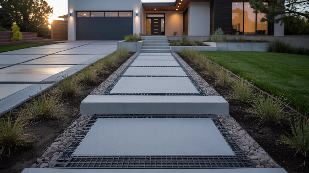 Improve drainage with 2% slope away from structures and strategically placed channel drains at thresholds. Install radiant-ready conduit or sleeves for low-voltage lighting below modern pergolas, plus stub-outs for gas lines and irrigation systems. Utilize fiber reinforcement and control joints at eight to ten feet on center. Complete with UV-stable sealers and slip-resistant textures for all-season usability.